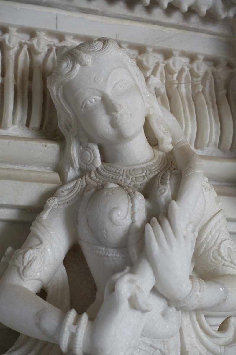 For our final day, we decided to go to Pawapuri, a place sacred to Jains as it is the place where Mahavira died in 527 BC. Jal Mandir, a white marble temple located in the middle of a lotus-filled sacred water tank has been built on the site of his cremation. Contrary to the temple in Kundalpur, this one was brimming with devotees and very busy. Most pilgrims were part of groups touring important Jain sites in Bihar and around; many of them for example had just climbed Parasnath Hill the day before (our next stop!). Many men were draped in white or pale robes while the women were dressed in their usual saris. Some of them held a white handkerchief in front of their mouths (maybe to avoid swallowing innocent insects inadvertently?). The atmosphere was a quiet one, no comparison to the usual hectic of a Hindu temple. We went around the water-tank and crossed the road to the Juna Samvasarna Mandir: a beautifully carved temple which we enjoyed more than the Jal Mandir.